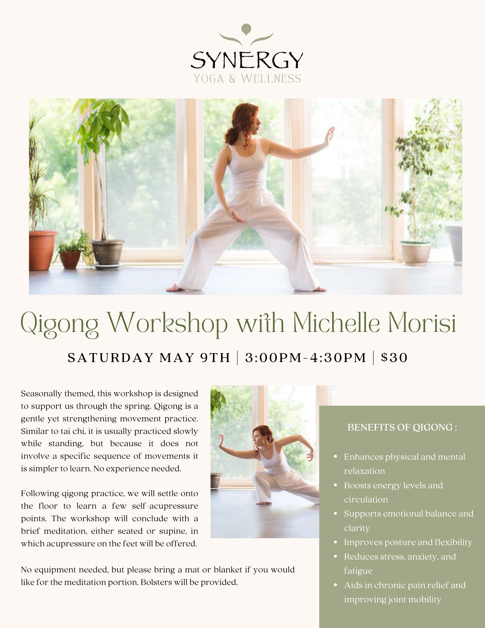 Qigong Workshop with Michelle Morisi Saturday, May 9, 2026 3:00 PM 4:30 PM Google Calendar ICS SIGN UP NOW