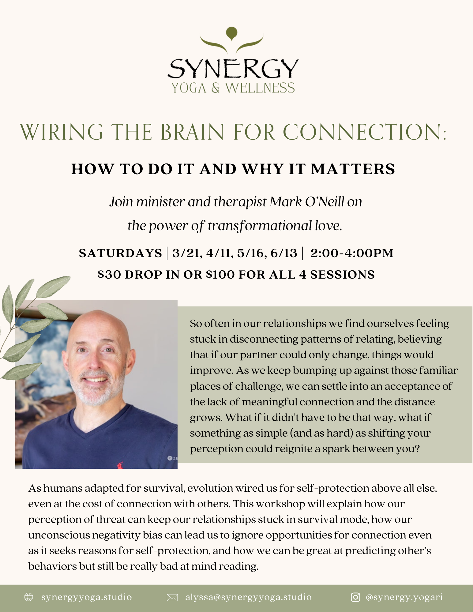 Wiring the Brain for Connection: How to Do It and Why It Matters w/ Mark O’Neill Saturday, March 21, 2026 2:00 PM Saturday, June 13, 2026 4:00 PM Google Calendar ICS REGISTER FOR AN INDIVIDUAL SESSION 4-SESSION SERIES PACKAGE *After purchasing this package, you will receive a confirmation email with a unique code. Please use this code to register individually for all four workshop dates to reserve your spots in each session.